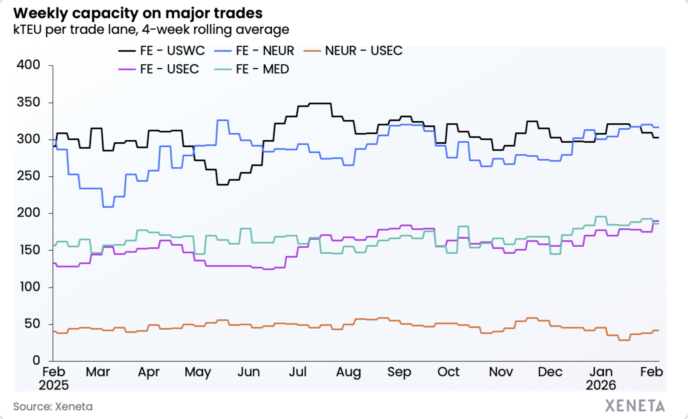 Average spot rates have fallen on all Far East fronthauls to the US and Europe in the past week, but...